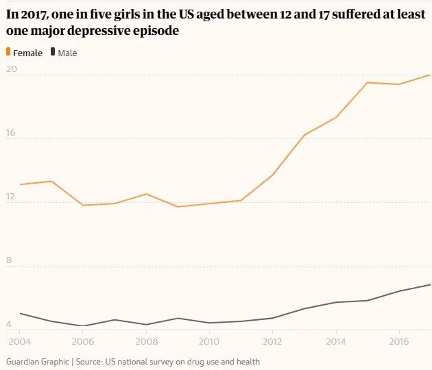 Even more tragically, we also see this trend in the rate of teenage suicide, which is rising for both sexes in the US and the UK. The suicide rate is up 34% for teenage boys in the US (in 2016, compared with the average rate from 2006–2010). For girls, it is up an astonishing 82%. In the UK, the corresponding increase for teenage boys through to 2017 is 17%, while the increase for girls is 46%. Nobody knows for certain why recent years have seen so much more of a change for girls than boys, but the leading explanation is the arrival of smartphones and social media. Girls use social media more than boys, and they seem to be more affected by the chronic social comparison, focus on physical appearance, awareness of being left out, and social or relational aggression that social media facilitates.